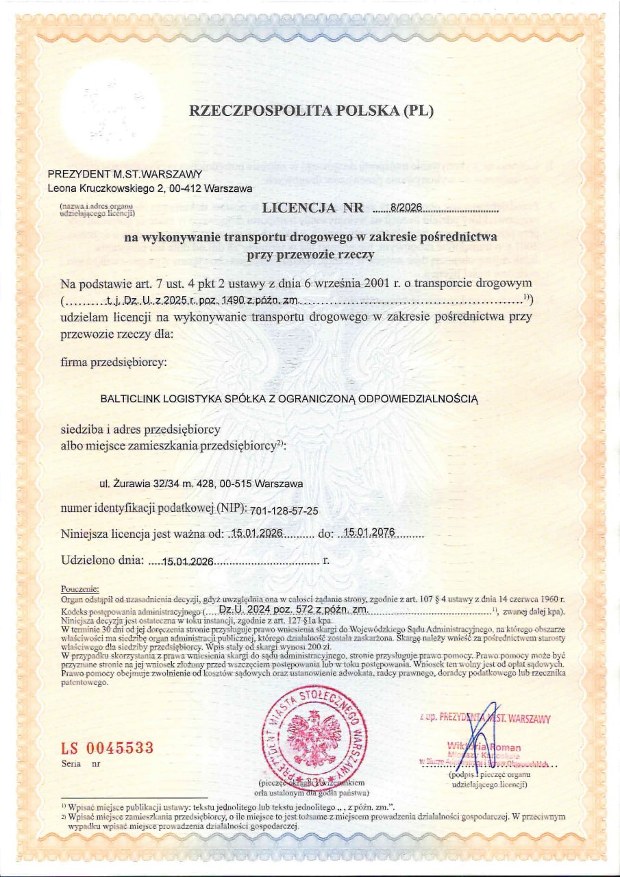 Nasi Klienci mają pewność, że powierzają swoje ładunki firmie, która działa legalnie, odpowiedzialnie i zgodnie z najwyższymi standardami branżowymi.